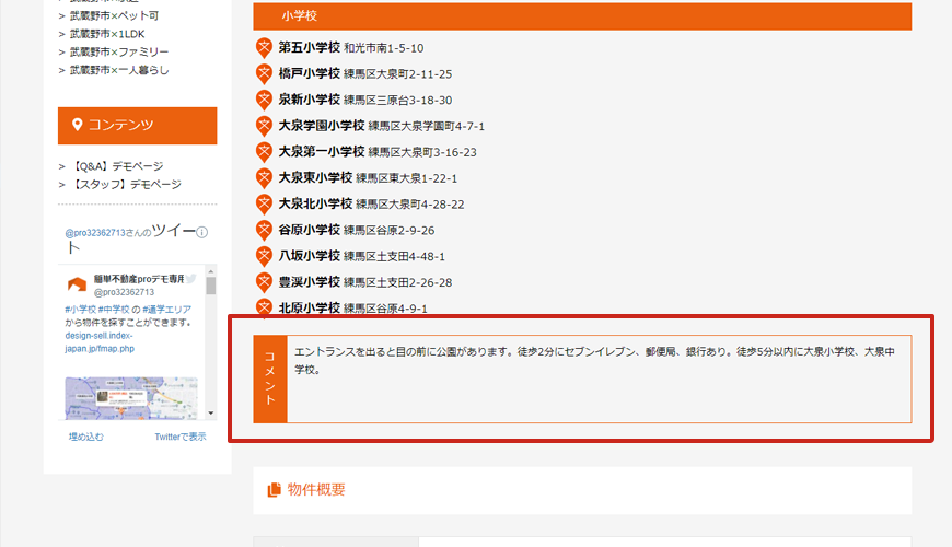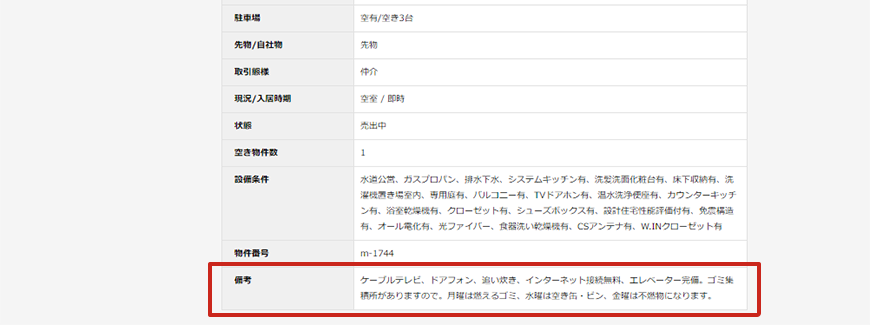 物件詳細の「物件概要」の最下部、備考の欄に表示されるコメントとなります。