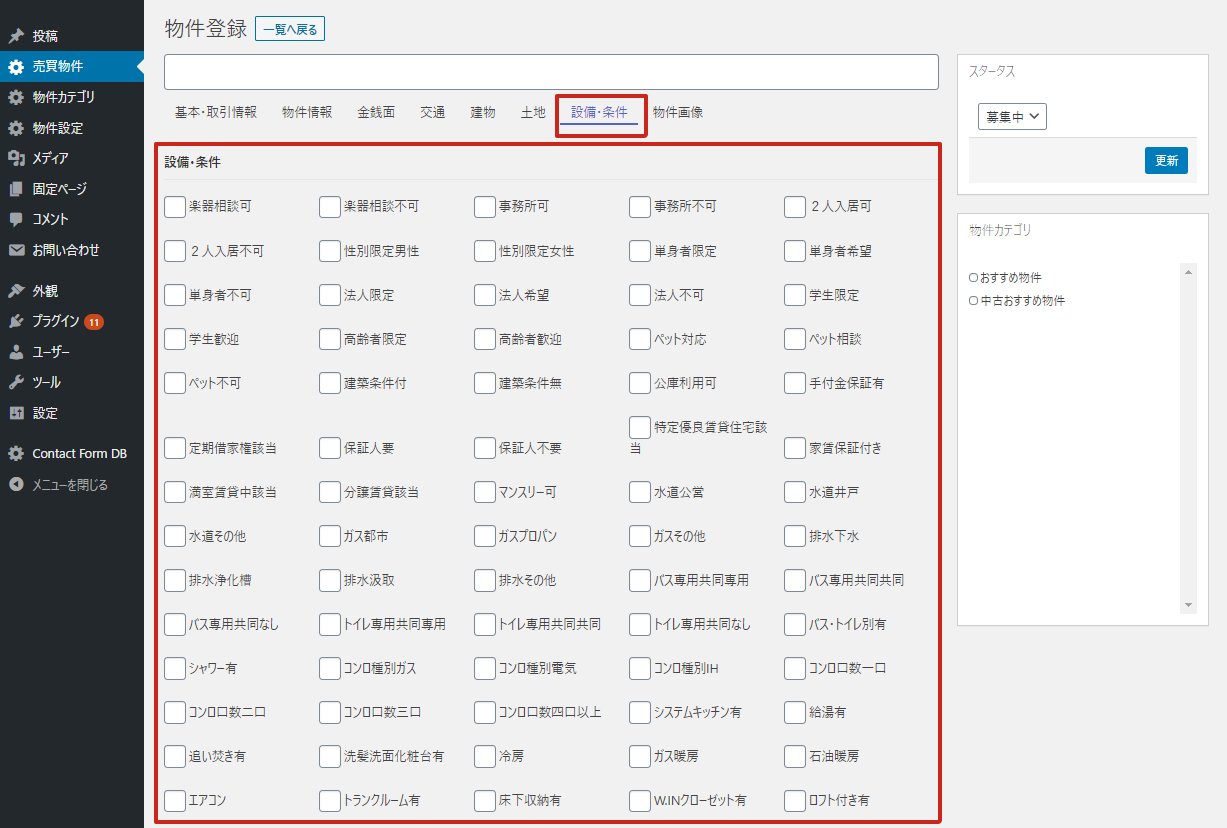 ここでは物件の設備や条件を項目にチェックすることで入力することができます。
