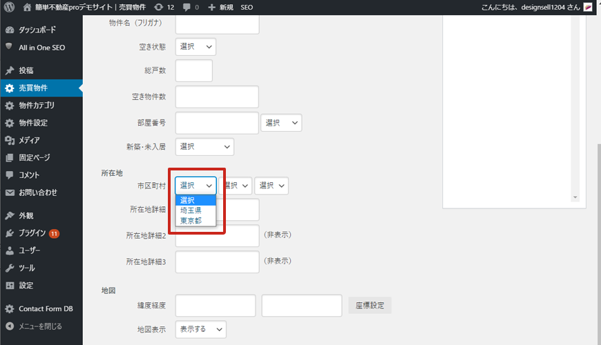 物件の所在地を入力します。ここで選択できる都道府県は「物件設定」で設定されたエリアとなります。