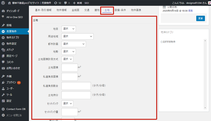 土地面積、用途地域、接道状況、引き渡し時期などを入力します。