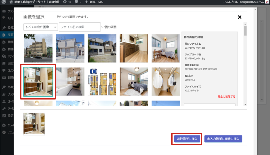 画像を選択すると、緑の枠が付きます。「選択箇所に挿入」をクリックします。