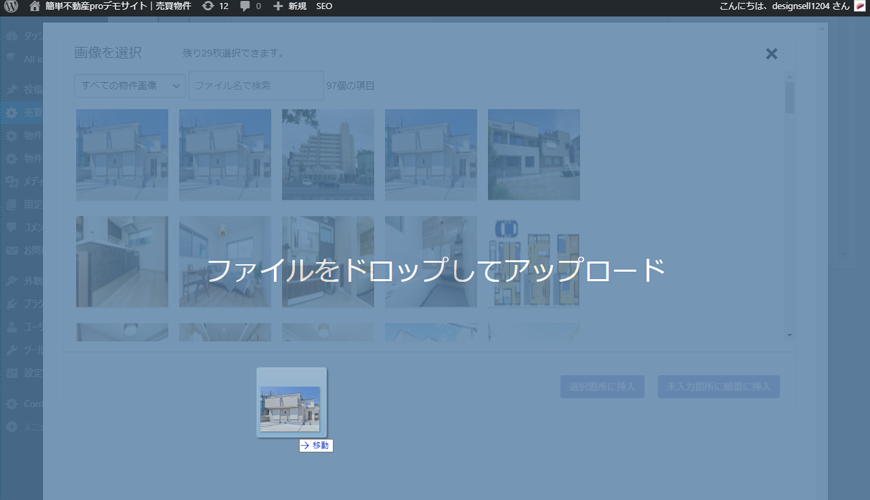 ここにない場合は、「画像を選択」画面に画像をドラッグ&ドロップしてアップロードします。