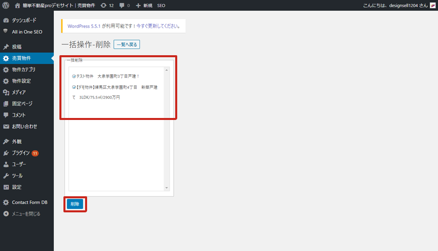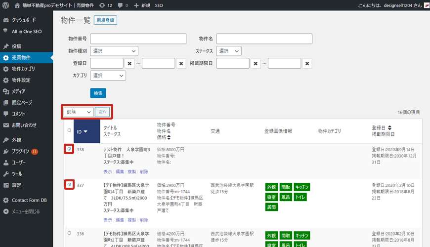 複数物件を削除したい場合は、削除したい物件にチェックを入れて、「一括操作」で「削除」を選択し「次へ」をクリックします。