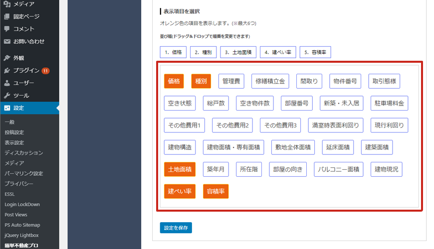 物件概要の「表示項目」は、物件詳細で表示される物件概要項目の設定です。