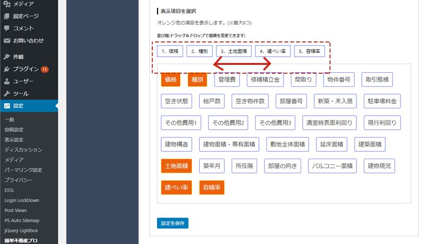 また、表示項目の順番をドラッグアンドドロップで変更して並び変えることもできます。