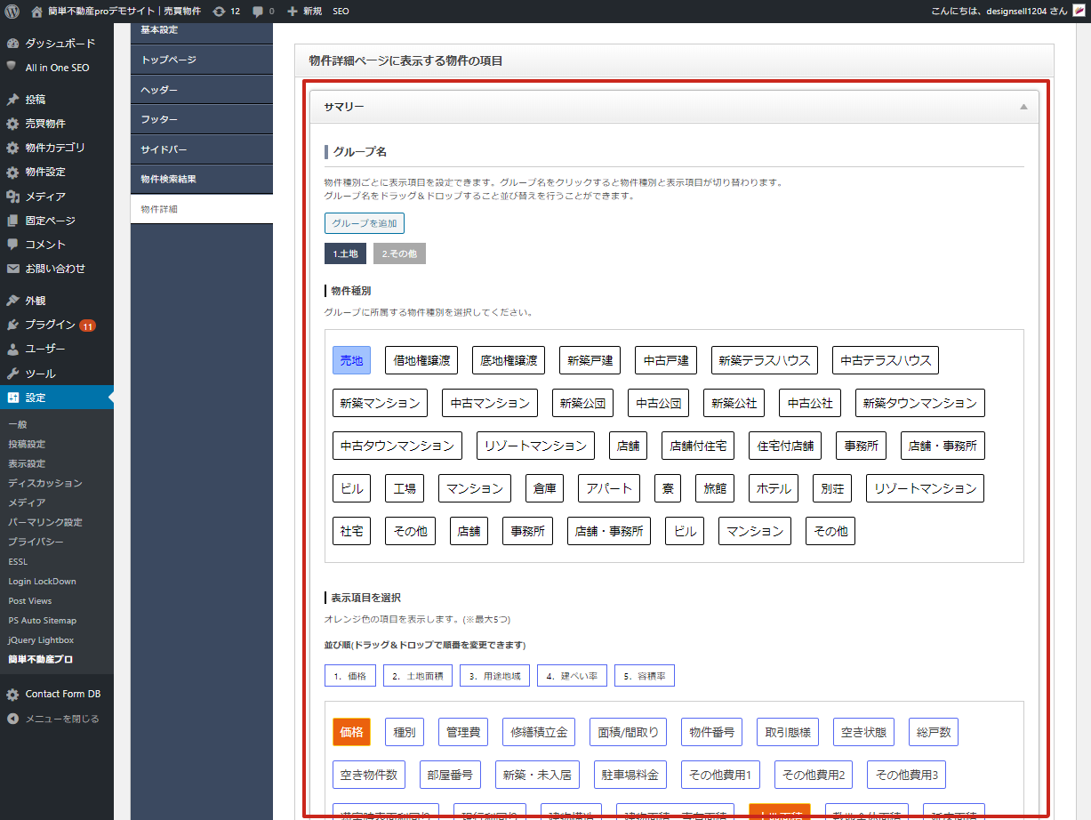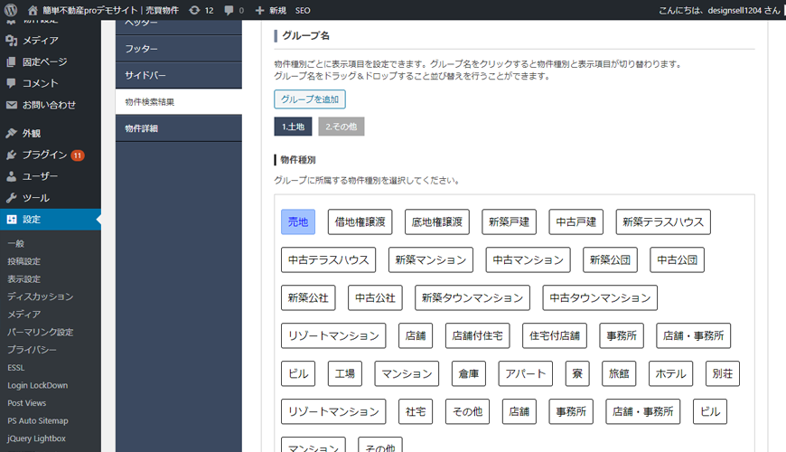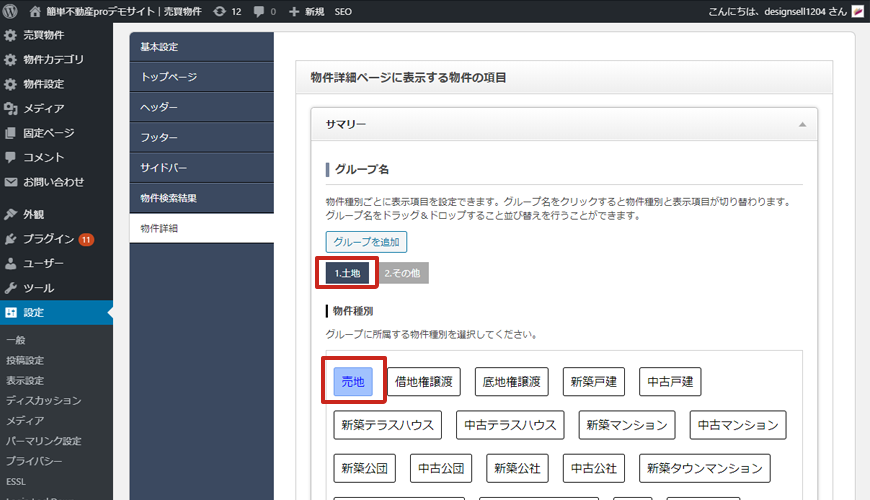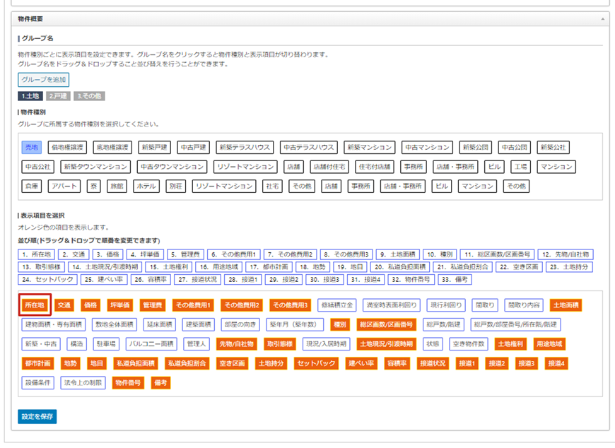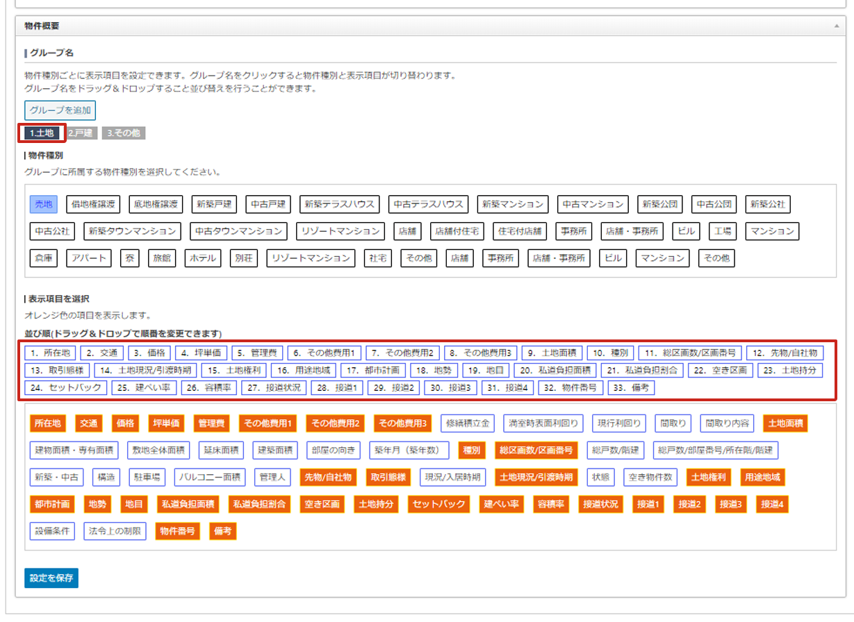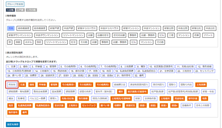 ここでは、「1.土地」グループをクリックしましたので、「1.土地」グループに含まれる種別の「売地」の物件詳細が表示された時の表示項目の設定となります。