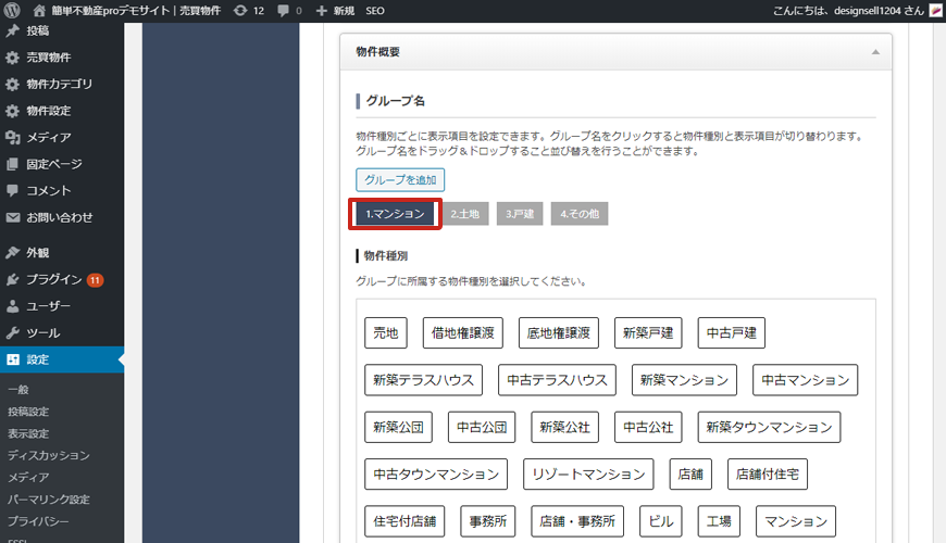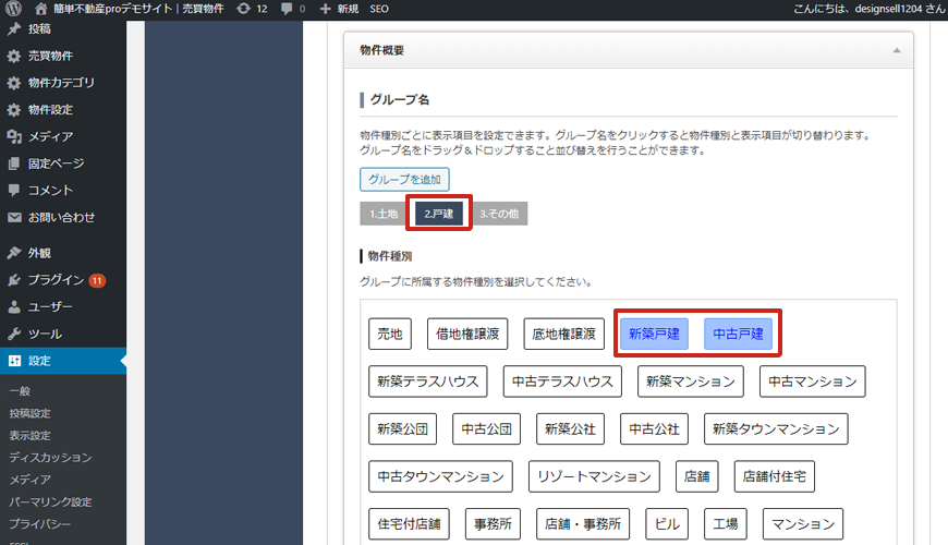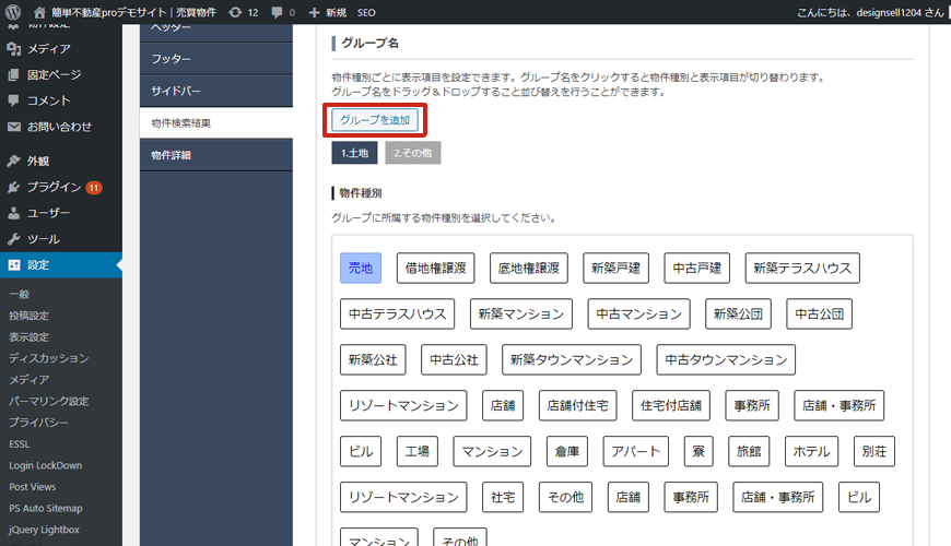 グループ名が設定されるので、既存のグループ名に対する種別追加と同様に、追加したグループ名に対する物件種別をクリックして設定します。