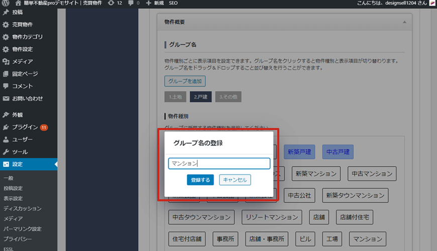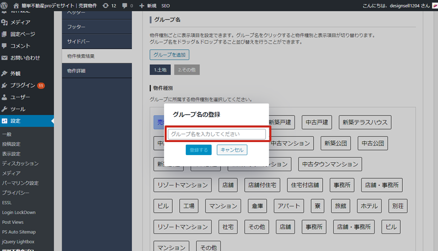 「グループ名」設定の画面になりますのでグループ名を入力します。グループ名が設定されるので、既存のグループ名に対する種別追加と同様に、追加したグループ名に対する物件種別をクリックして設定します。