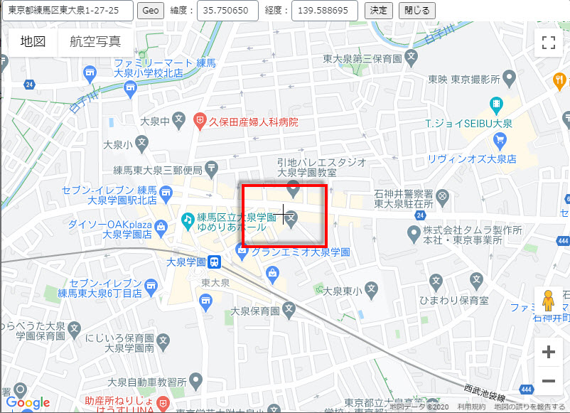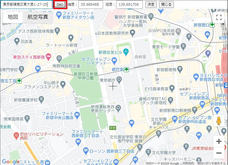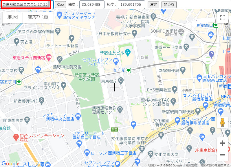 表示されたウインドウでマップの中心位置に設定したい住所を入力します。