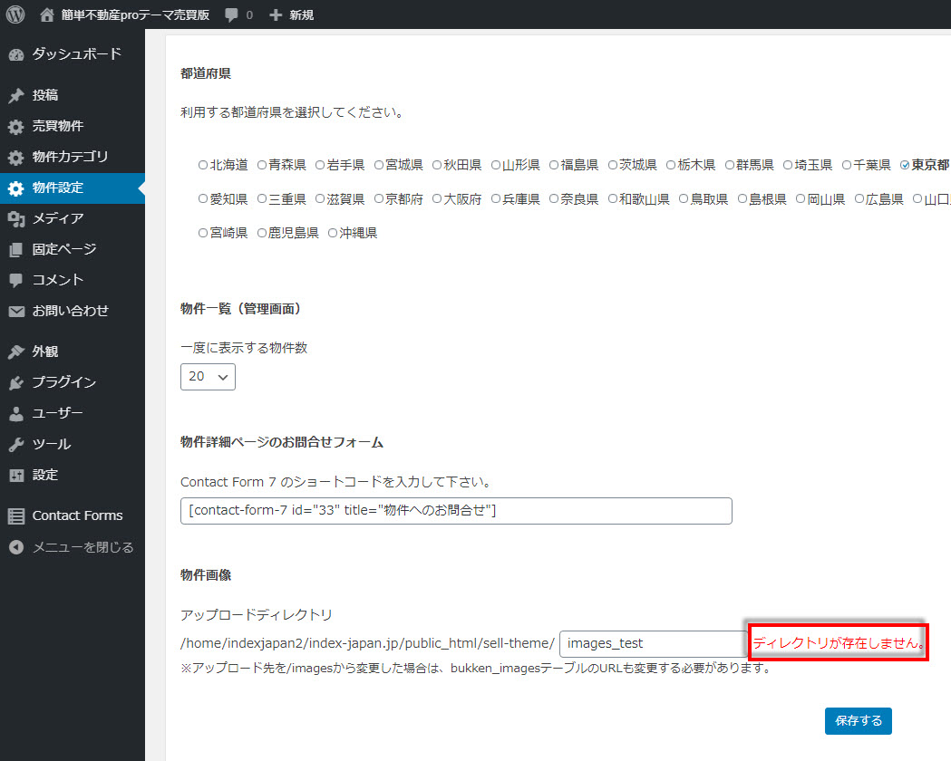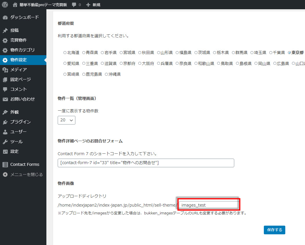 管理画面のサイドメニューから物件設定するとアップロードディレクトリを入力する欄を確認できます。新しいアップロードディレクトリ名を半角英数字で入力します。※日本語名は使用できません。ここでは「images_test」という名前で保存します。