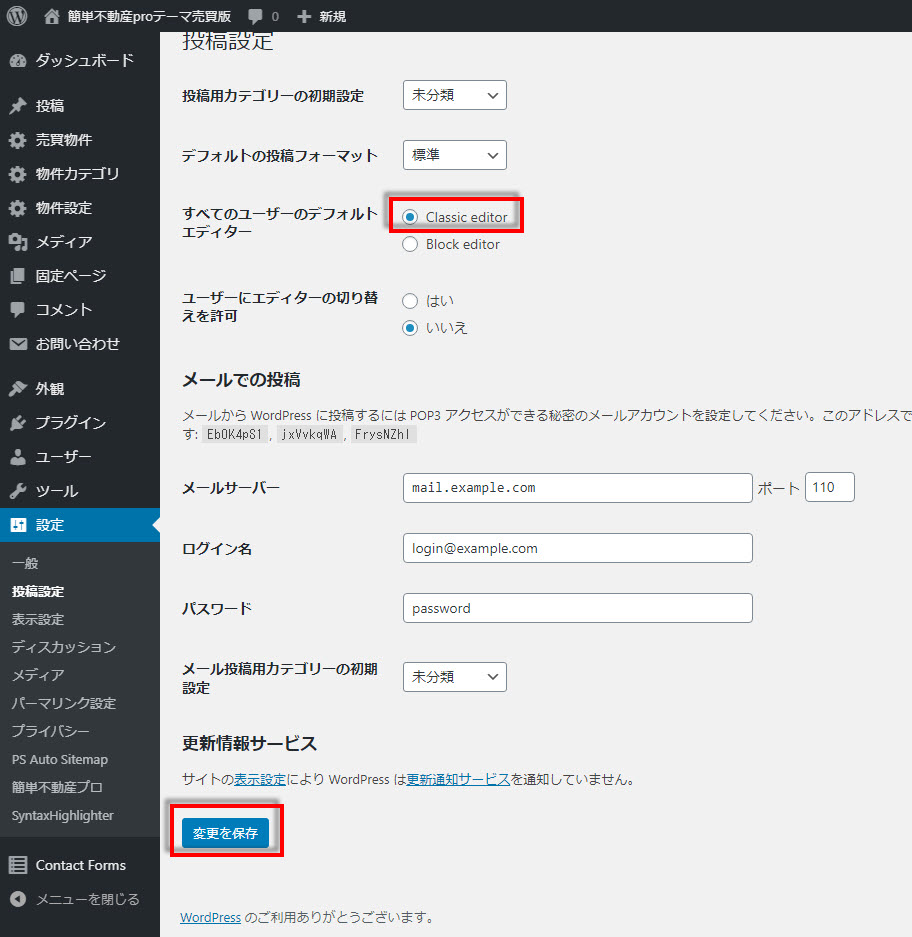 有効化が完了したら、管理画面の「設定」->「投稿設定」を選択します。すべてのユーザーのデフォルトエディターで「Classic editor」を選択し、「変更を保存」ボタンをクリックして保存します。