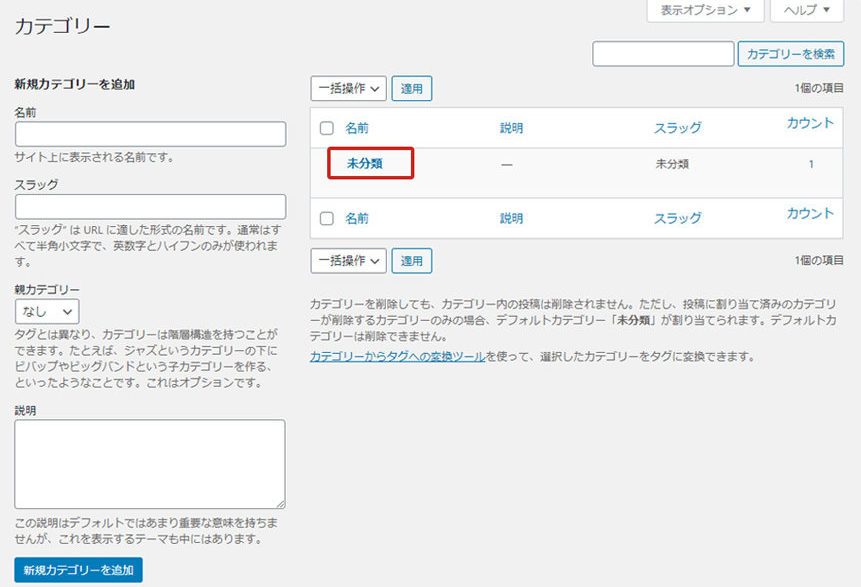 カテゴリーに「未分類」が設定されているので、「未分類」をクリックし、編集します。