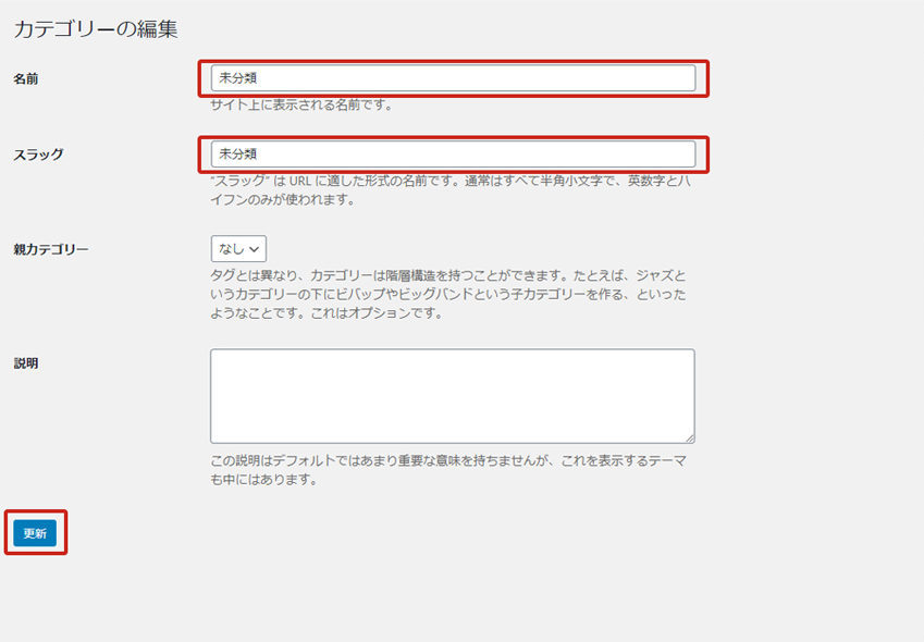 カテゴリーの編集画面で、名前を「ブログ」、スラッグを「blog」に変更します。変更したら「更新」をクリックします。