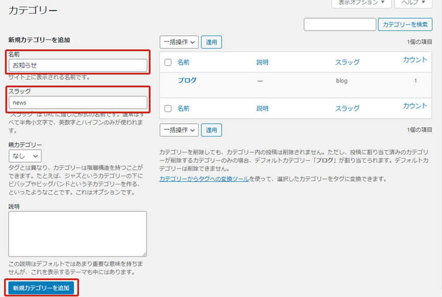 名前に「お知らせ」、スラッグに「news」を入力し、「新規カテゴリーを追加」をクリックします。