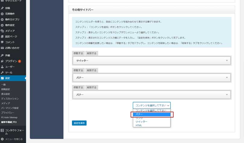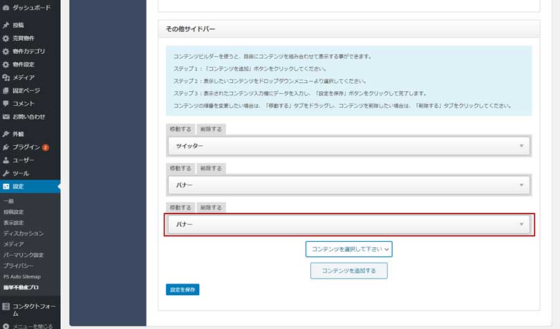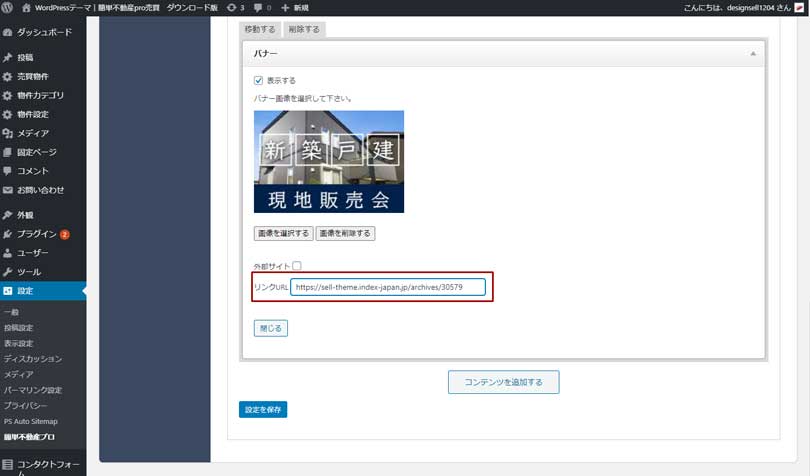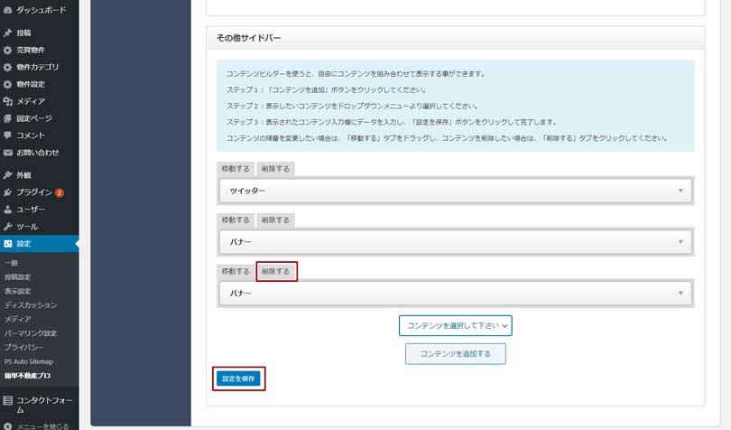 またバナーが不要になった場合は、設定した「簡単不動産プロテーマ > その他サイドバー > バナー」で「削除する」をクリックし削除し、「設定を保存」をクリックします。