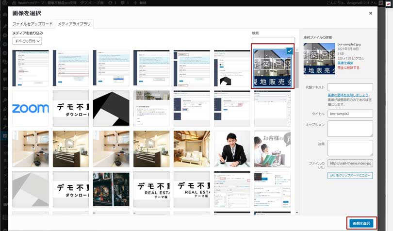 「画像を選択する」をクリックすると「画像選択」画面が開きますので、ここに作成したバナーをドラッグアンドドロップしてアップロードします。