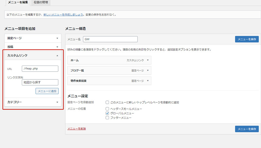 メニューを作成します。 管理画面にログインします。 外観>メニュー をクリックします。 メニュー設定画面になるので、ここでメニューを作成します。 作成するメニューは以下...