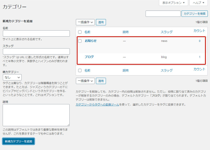 投稿カテゴリーを作成します。 管理画面にログインします。 投稿>カテゴリー をクリックします。 カテゴリーに「未分類」が設定さ...