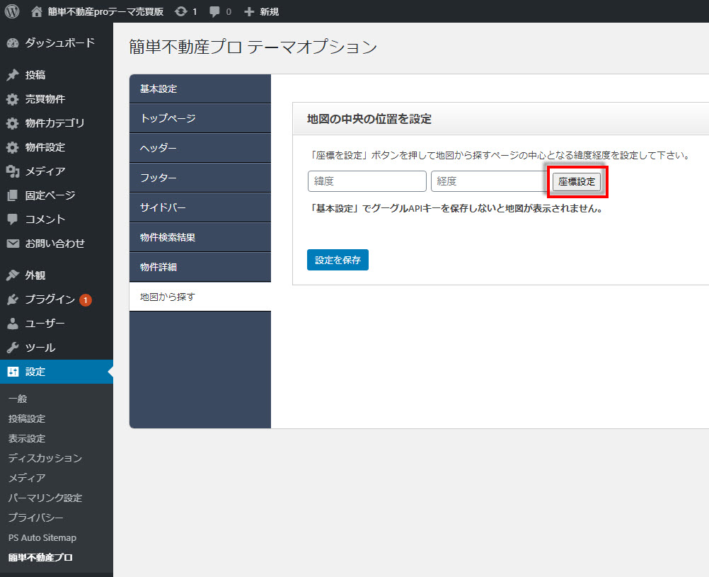 サイトURL/fmap.phpでアクセスできる地図から探すの表示場所の設定方法です。 「設定」->「簡単不動産プロ」->「地図から探す」で座標設定をクリックします。 表示さ...