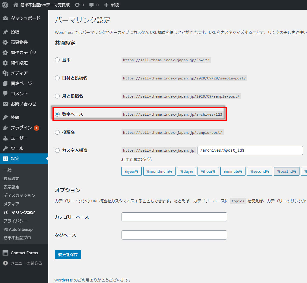 簡単不動産proではパーマリンクを数字ベースに変更する必要があります。 「設定を保存」をクリックします。